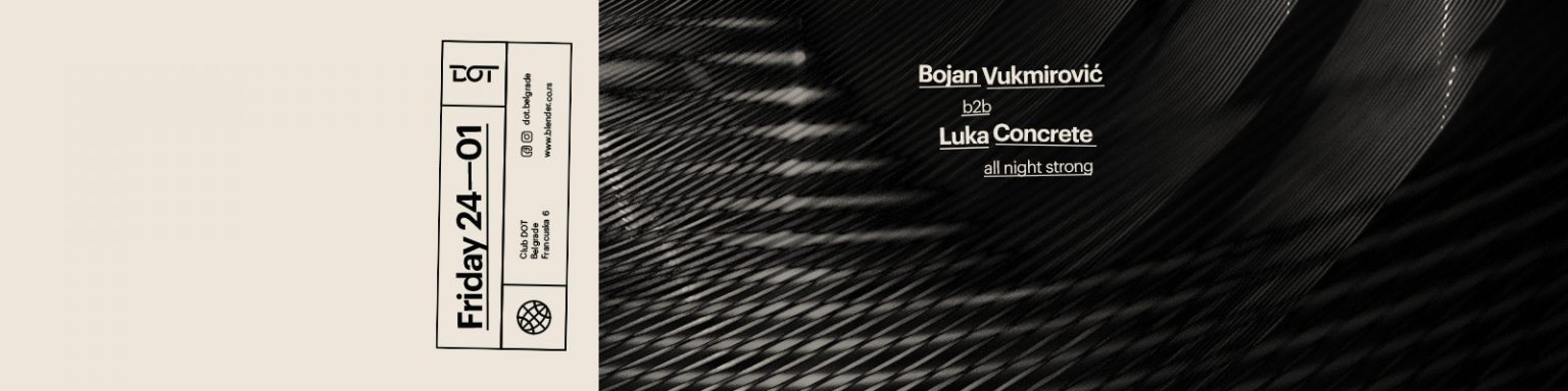 Popularan techno dvojac Luka Concrete i Bojan Vukmirović, članovi beogradskog kolektiva Concrete DJz, u petak, 24. januara u klubu DOT, svim ljubiteljima tvrđeg zvuka, pripremaju specijalan b2b set, u okviru svog tradicionalnog all nighter koncepta.